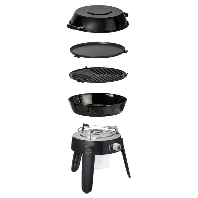 This compact, versatile gas barbecue weighs less than 4 kg and comes with at least four different cooking surfaces; a burner with potstand, a BBQ grid, a grill plate and a lid/dome (the lid/dome can also be used as a pot).