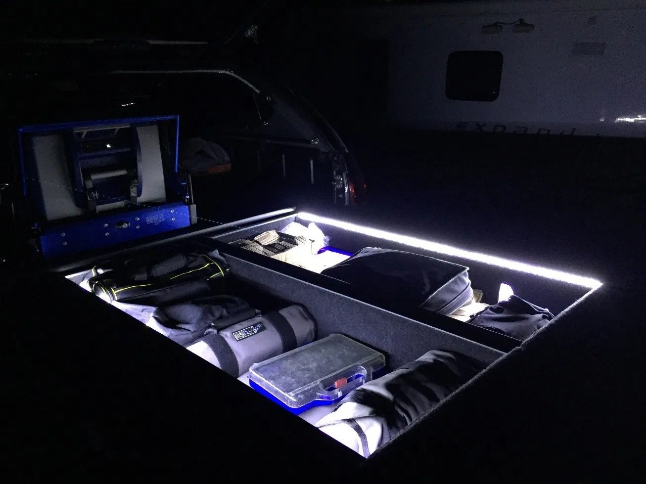 يسمح “قفل البقاء مفتوحًا” الحاصل على براءة اختراع للدرج بالبقاء في وضع الفتح حتى على منحدر بزاوية 30 درجة. كما تتميز الأدراج بشريط إضاءة LED يعمل تلقائيًا عند تمديد الدرج بالكامل، مع مفتاح تجاوز يدوي. يوفر نظام القفل الآمن 100% حماية استثنائية، حيث لا يمكن فتحه عنوة من الأسفل. تضمن الأختام المقاومة للغبار حول الألواح الأمامية بقاء جميع الأغراض المخزنة بالداخل نظيفة وخالية من الغبار. تتوفر أطقم الأجنحة الجانبية المتساطحة لمعظم سيارات الدفع الرباعي والبيك أب، مما يخلق مساحة تخزين إضافية بين نظام الأدراج والجوانب الداخلية للسيارة. يمكن الوصول إلى هذه المساحة عن طريق إزالة الأجنحة والألواح الأمامية. توفر دعامات طقم الأجنحة المقواة قاعدة مدعومة بالكامل لتثبيت قواعد انزلاق الثلاجات على الألواح الجانبية، مما يتيح المزيد من خيارات التثبيت.